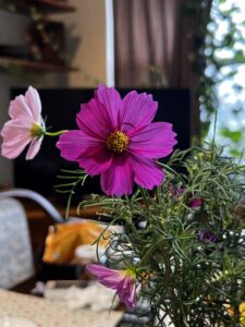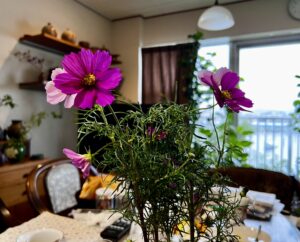 🌺 10/26 Kumiko&Cosmos 冬支度が必要なくらい気温が下がってきた。娘にしか頼めない仕事がある。ワイワイ話をしながら衣類の入替え、クリーニングに出すものの仕訳、ショートスティ用衣類の記名など無事終了!Thank you! 一緒にLiving Willのチェックも完了(Great!)きれいなコスモスも来た、ありがとう!!