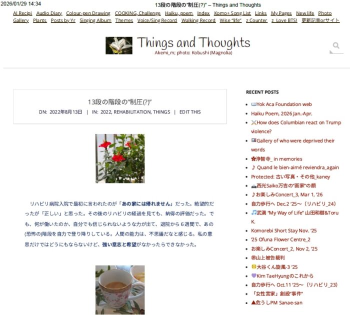 Adobeを契約してるので「webpage」を繋げて一冊の本のようにして見たいと思った。SWAYでやってみたが画像が多すぎて編集ができなかった。1月末から2,3日で完成、嬉しい。最初の日誌「13段の階段の”制圧(?)”」からリハNo.24までを繋げた。ページ全体のアップはできない。