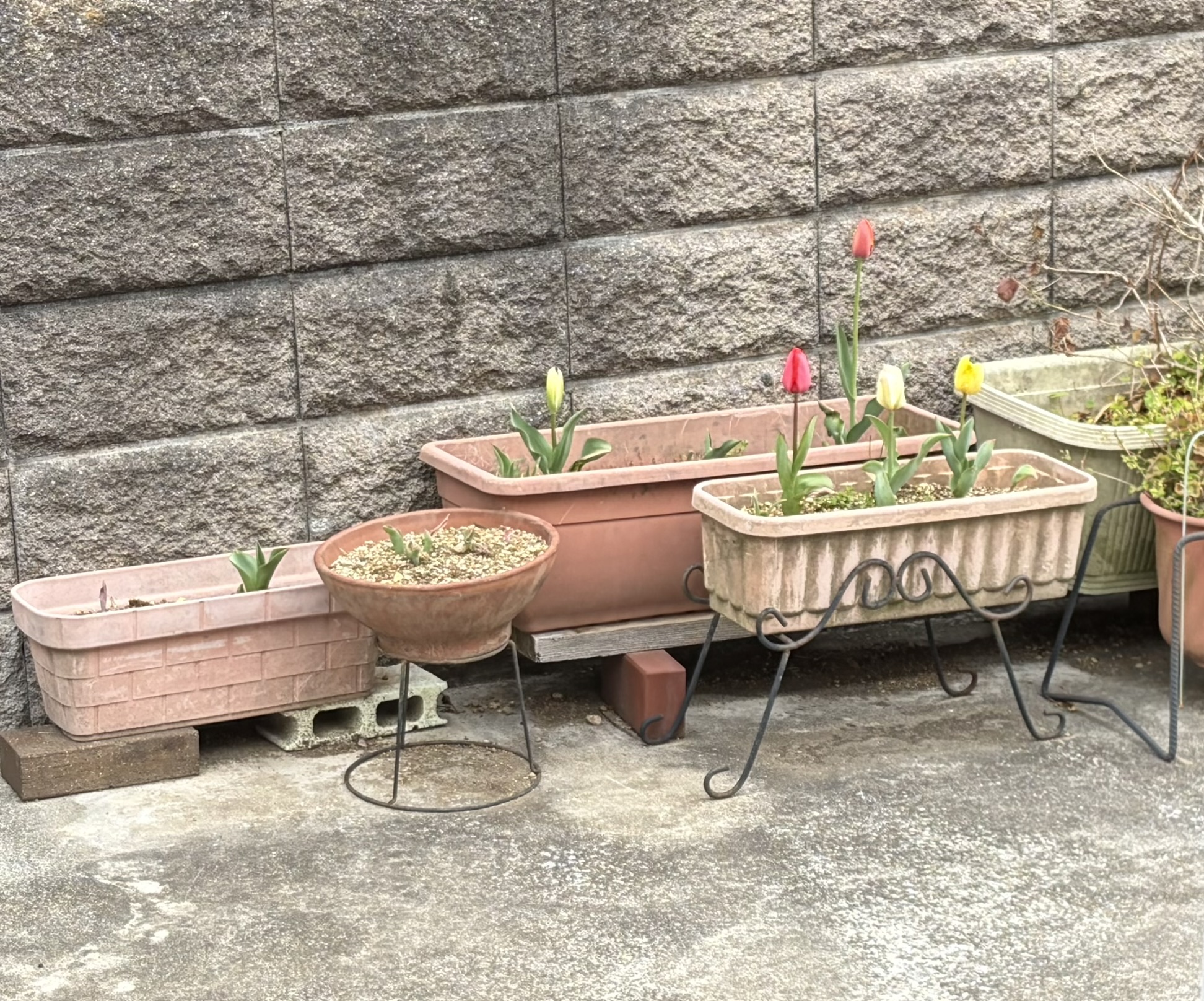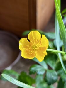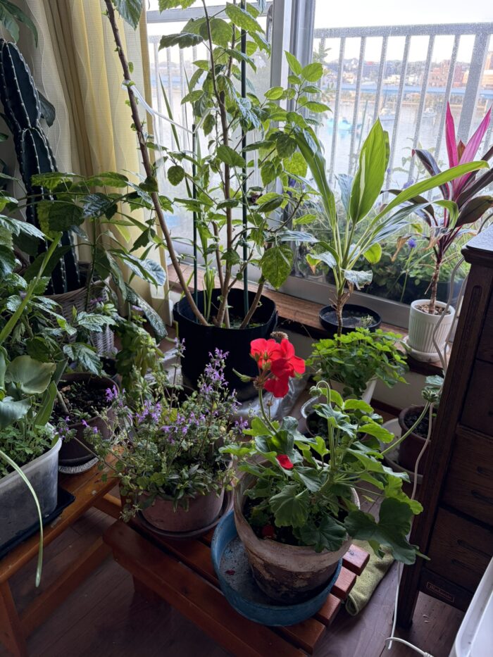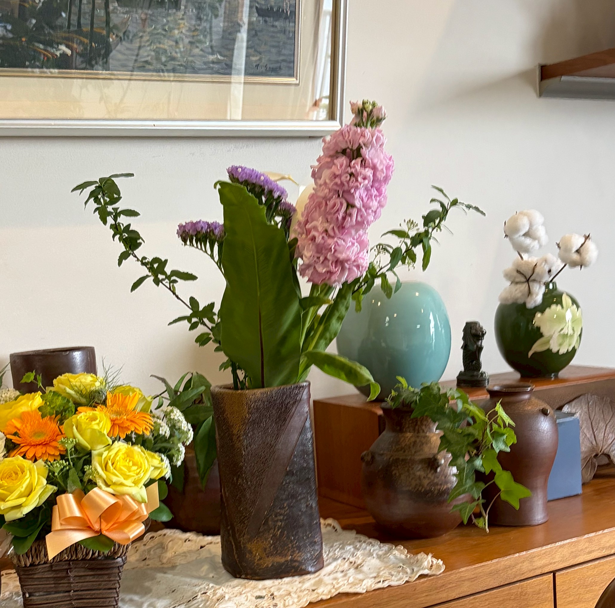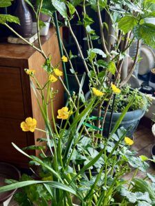 部屋の中には寄せ植えのヒヤシンスが咲き、チューリップ、花大根、カラー、仏の座などが蔓延っている。