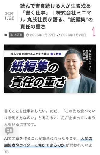 書くことを仕事にしたい。ただ、「この先も食べていける働き方なのか」と考えると、足が止まってしまう人もいるはずです。AIで文章を作ることが簡単になった今こそ、人間の編集者やライターに何ができるのかが問われています。そこで今回は、紙の編集とライティングを軸に少数精鋭の制作チームを率いる、株式会社ミニマル代表取締役・丸茂健一さんにお話を伺いました。旅行雑誌の編集から独立し、法人化へと進んできた丸茂社長の歩みから、「書く仕事」で評価され続けるための考え方をのぞいてみます。