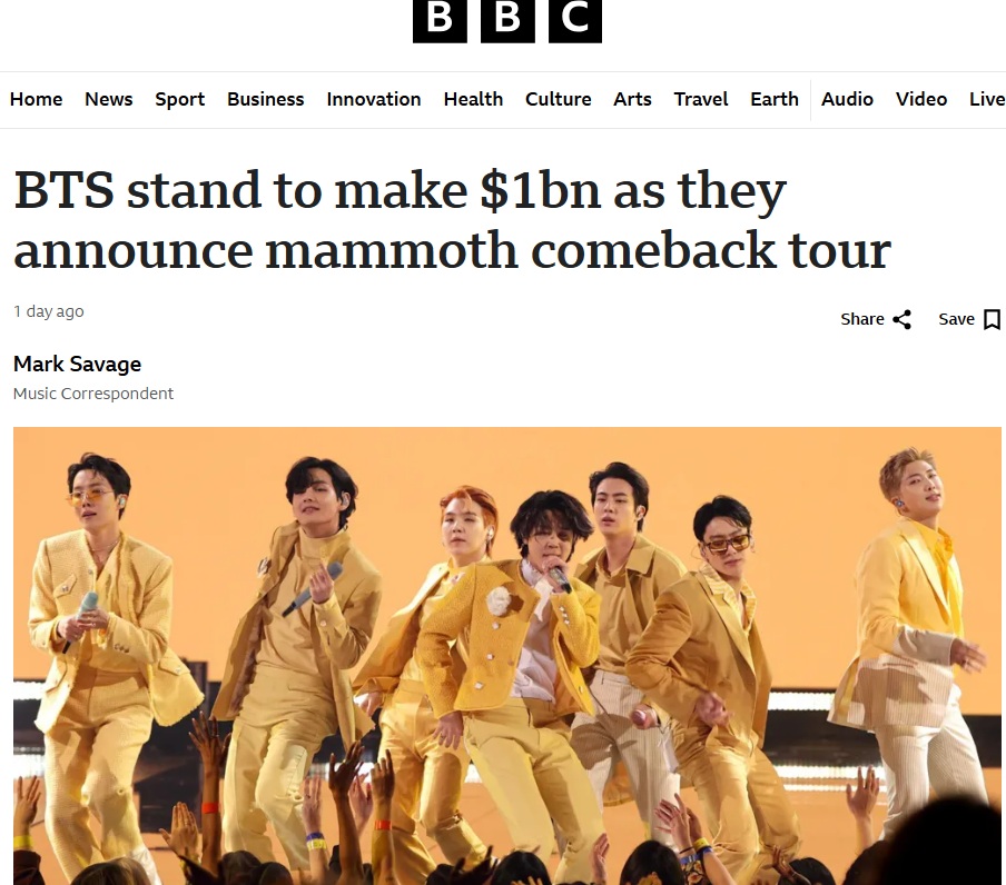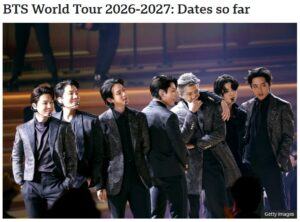( BBC 15, Jan, 2026) K-pop idols BTS have announced a globe-spanning, 79-date world tour, marking their return to the stage after a four-year hiatus. With dates in London, Tokyo, Munich, Sydney and Los Angeles, it’s likely to be one of the biggest tours of the year, especially as the band haven’t played outside the US and South Korea since 2019.
