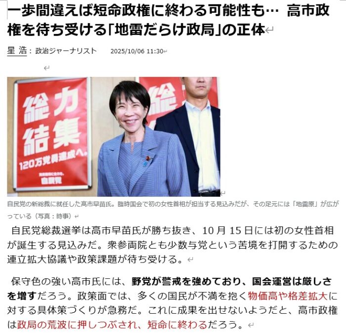 あれあれ?どうなる「女性」首相候補。「ガラスの天井」の問題ではない、LDPとSanae氏自身の自業自得の窮地。 でも首相になる前にこんなことまでになるとは、さすがの私も思わなかった。(10/7 高市自民党総裁 & (何故か)麻生の妹が「新宮家」)