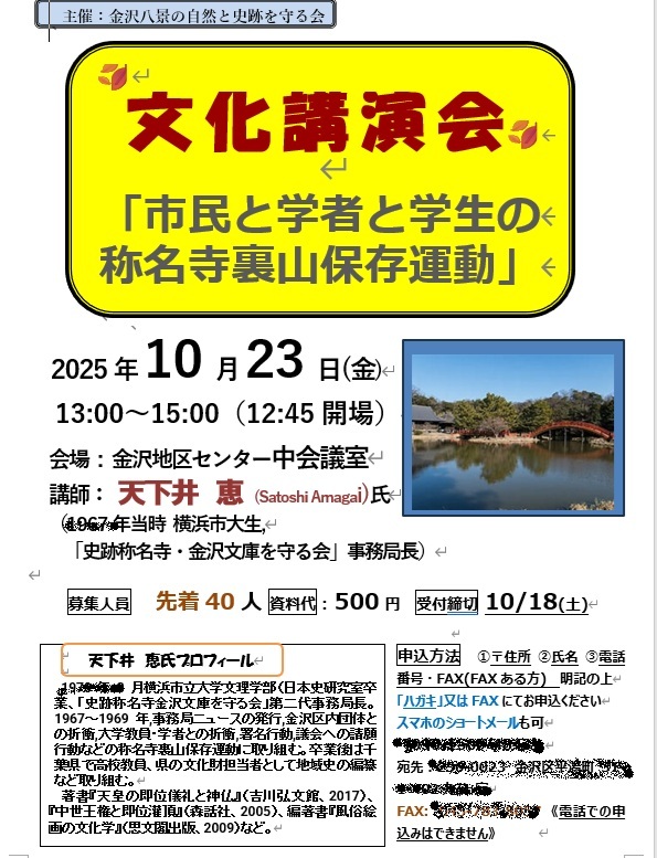 🍂10/24 「文化講演会」称名寺保存運動天下井さん:久しぶりの邂逅 ; 私よりお喋りの人がいた!市大の思い出、千葉での生活、本の出版希望など。40人超の参加者には驚き・感激。