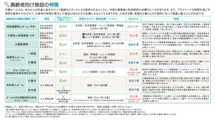公的施設vs民間、医療依存度、住宅型vsサ高住、サ高住にも一般vs介護・・・(とややこしい)。費用、area、availability, etc.