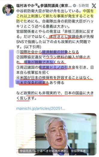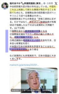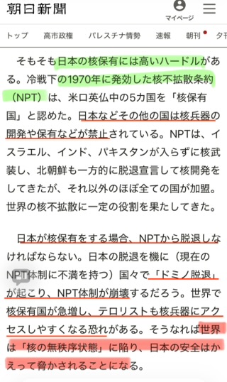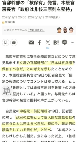 首相官邸の幹部は18日、報道陣に対し、日本を取り巻く厳しい安全保障環境を踏まえ、個人の見解としつつ、「日本は核兵器を保有すべきだ」との考えを示した。この官邸幹部は、高市早苗首相に対し安全保障政策などについて意見具申をする立場にある。ただ、実際に政権内で議論を進めているわけではなく、核不拡散条約(NPT)体制との兼ね合いなどから実現は難しいとも指摘した。朝日新聞