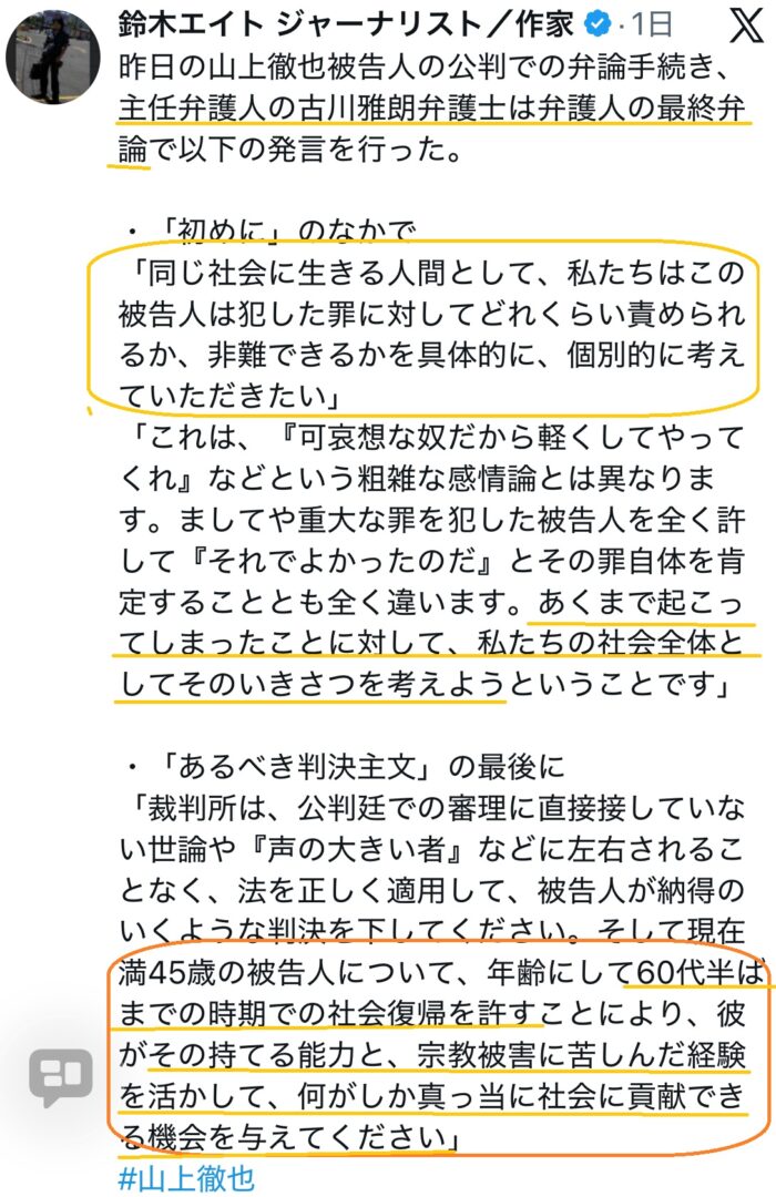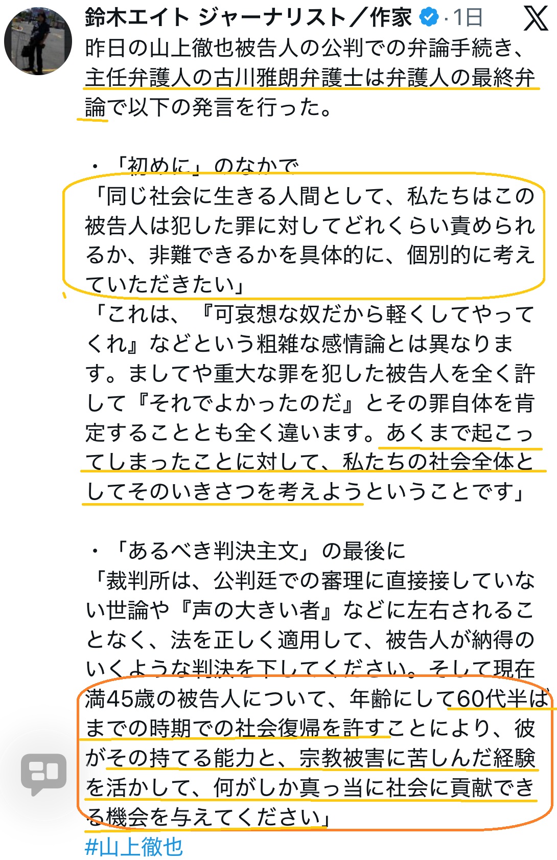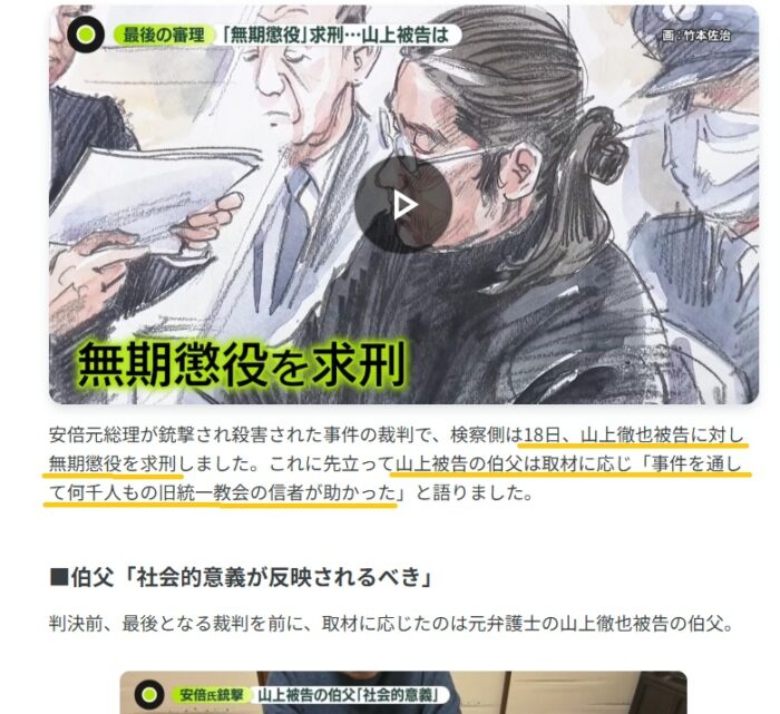 弁護側は、山上被告が「教団に翻弄された人生であると強く思うようになった。復讐心から、打撃を与えるために犯行を決めた」と考えていたと説明。教団側への襲撃ができず、「(教団に)親和的な政治家を襲撃することが自らの目的に沿う」と考えるようになったとした。