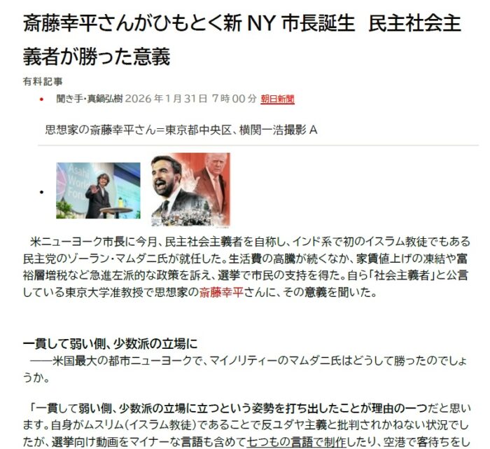 •米ニューヨーク市長に今月、民主社会主義者を自称し、インド系で初のイスラム教徒でもある民主党のゾーラン・マムダニ氏が就任した。生活費の高騰が続くなか、家賃値上げの凍結や富裕層増税など急進左派的な政策を訴え、選挙で市民の支持を得た。自ら「社会主義者」と公言している東京大学准教授で思想家の斎藤幸平さんにその意義を聞いた。