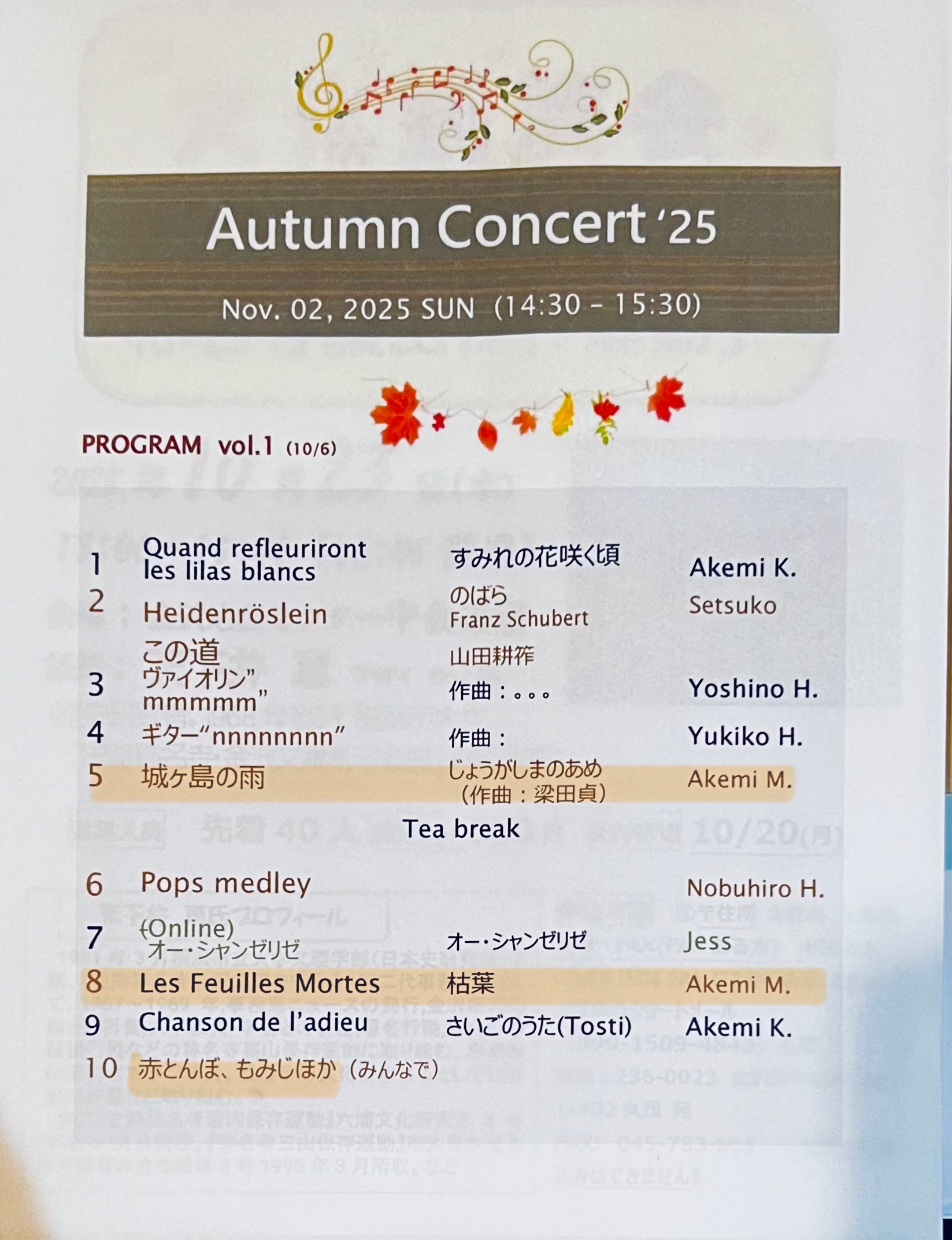 あけみKさんは「又 歌会に誘ってくださいね。」と言ってるし、Ms Hayasは「娘がEine kleine Nachtmusikを始めた」と言ったではないか?私は「Les Feuilles Mortes」を暗記して歌おうっと! 準備などは(こちら: Autumn Concert ’25)